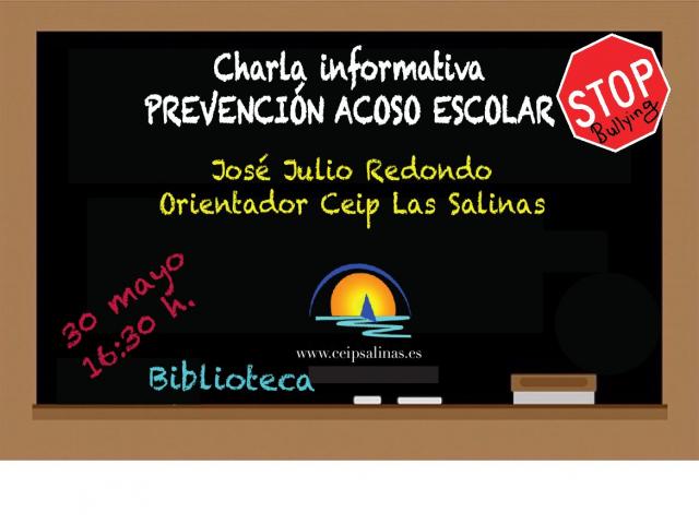 - El lunes a partir de las 16 h. tendrá lugar una nueva reunión del Viaje Fin de Primaria. A las 16:30 h. comenzará la charla sobre ACOSO ESCOLAR. Los alumnos de Segundo de Primaria irán a realizar "Un paseo por la historia" en Laujar. El alumnado de 5 años irá de excursión al parque de El Ejido.