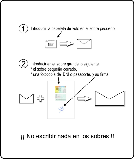 - En el otro sobre en blanco, que contendrá firma manuscrita, se mete el sobre cerrado con la papeleta del voto y una fotocopia del DNI del votante.