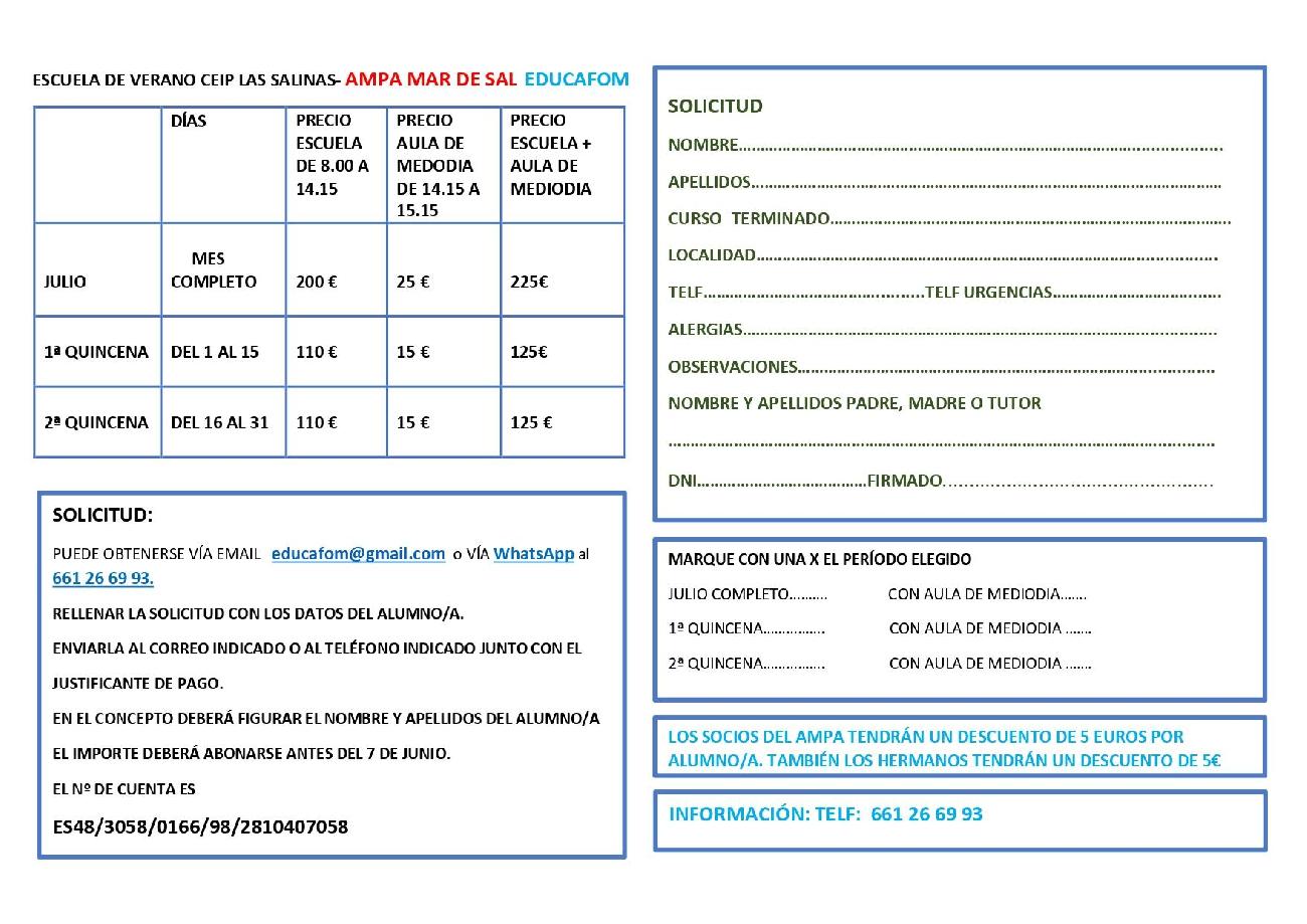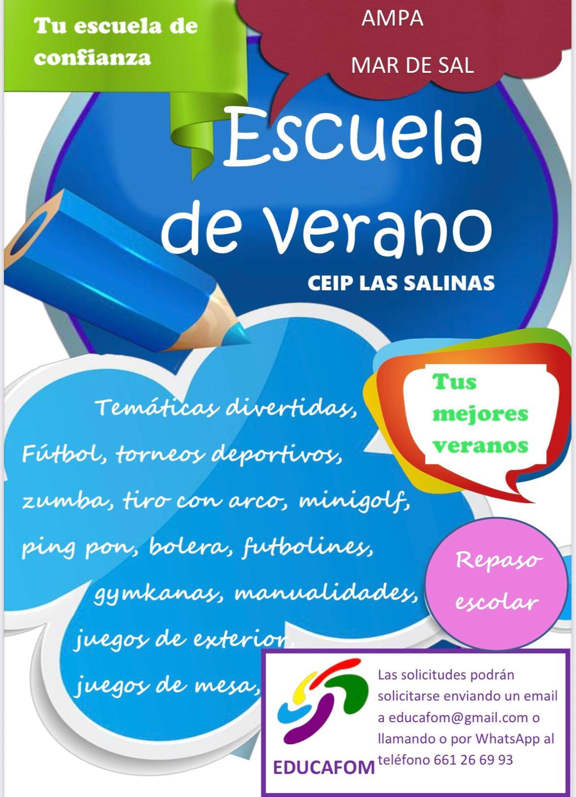 Un año más, con la finalidad de promover la conciliación de la vida laboral y familiar, la AMPA Mar de Sal en colaboración con la empresa EDUCAFOM, pone en marcha la escuela de verano en nuestro centro. Durante el mes de julio, el alumnado podrá divertirse y aprender en un entorno familiar.